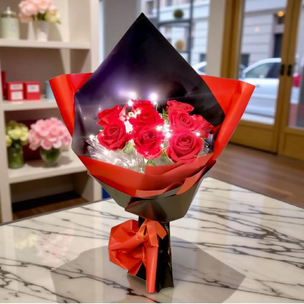 Gerçeğinden ayırt edemeyeceğiniz 1. sınıf 9 kırmızı yapay gül ile hazırlanan ışıklı buketimiz.