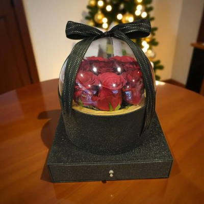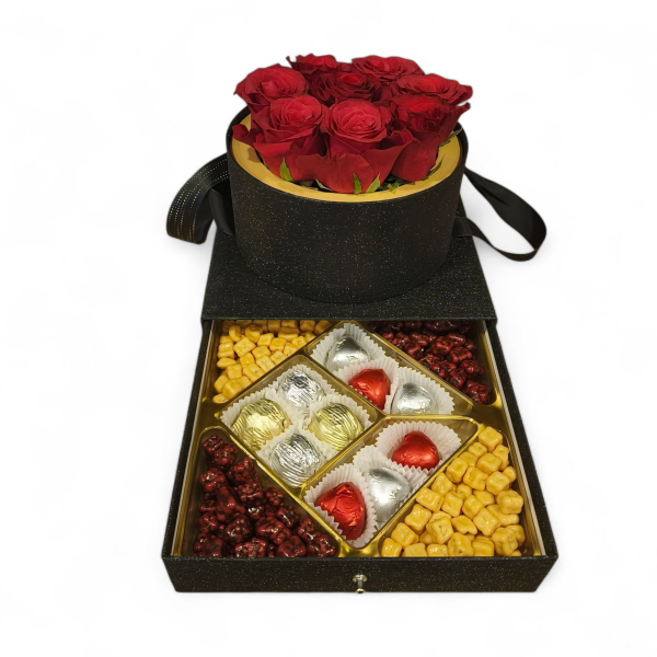 Fanus kapaklı kutuda 7 kokulu yapay kırmızı gül ve çikolatalar