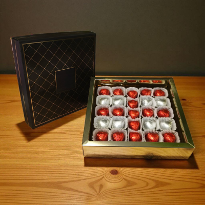 Hediyelik kutuda 25 adet yaldız sargılı karışık renkli kalp çikolatalar ile sevginizi anlatmanın en lezzetli yolu...