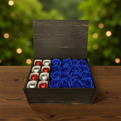 Hediyelik kutuda kalp çikolatalar ve kokulu mavi yapay güller ile sevginizi anlatmanın en lezzetli yolu...
